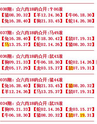 | 038期:[狗21.马25.鼠19.鸡10.羊24.虎06]开(?00) | |